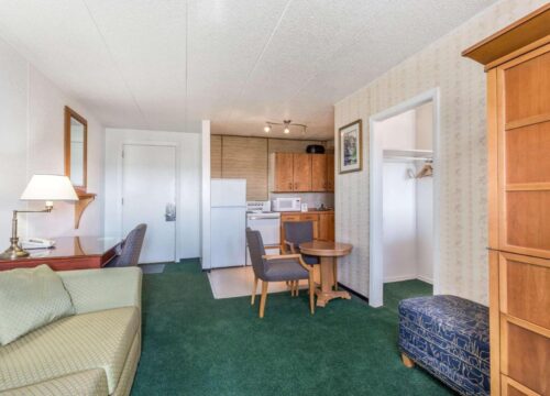 Food & Drink: Refrigerator, microwave, and coffee/tea maker